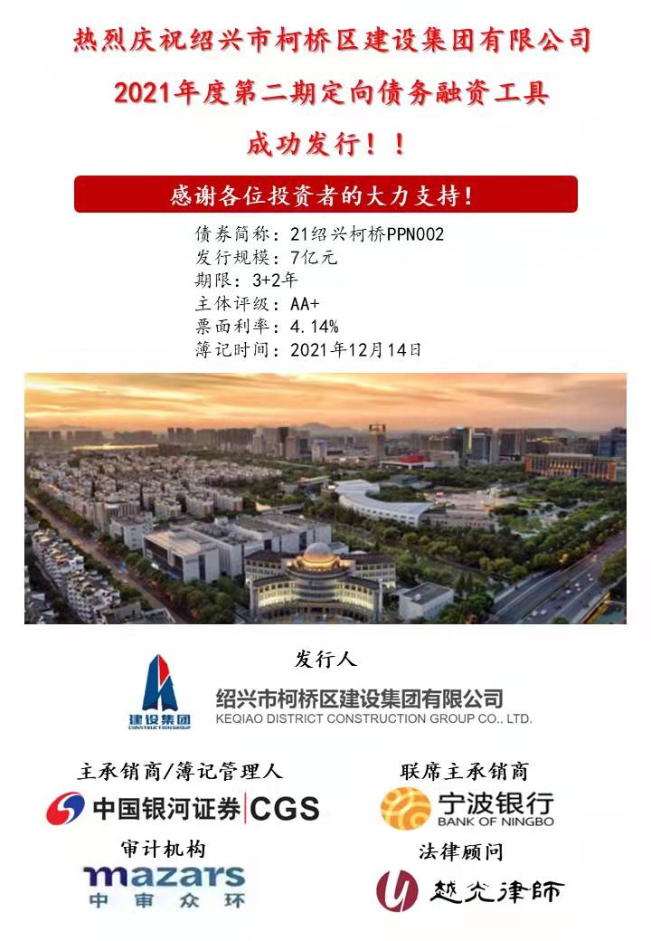1214日,紹興市柯橋區(qū)建設(shè)集團有限公司2021年第二期定向債務(wù)融資工具成功簿記建檔,規(guī)模7億元,期限3+2年,AA+主體無擔(dān)保,票面利率4.14%
