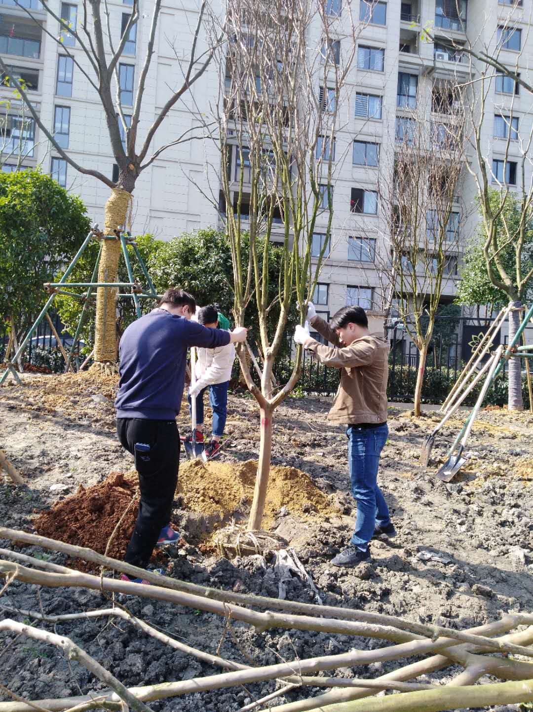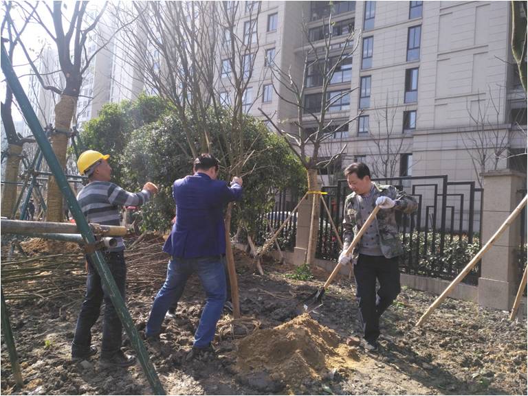 雖是春寒料峭,但植樹活動現(xiàn)場卻呈現(xiàn)出一派熱火朝天的景象,大家分工明確,密切配合,有的揮鍬鏟土、有的扶樹填土、有的培土澆木,忙的不亦樂乎。經(jīng)過一個(gè)多小時(shí)的勞動,紫薇、茶花、桂花、蠶絲海棠等100余株樹苗在周邊綠化帶里“安家落戶”,為時(shí)尚紡城再添新綠。