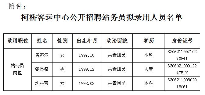 紹興柯橋客運中心有限公司因工作需要,經(jīng)國資辦批準(zhǔn)面向社會公開招聘基層類崗位站務(wù)員3人,通過筆試、面試、素質(zhì)考察、體檢、政審考察等程序后,擬錄用黃蘇爾等3位同志?,F(xiàn)予以公示,并就有關(guān)事項通告如下: