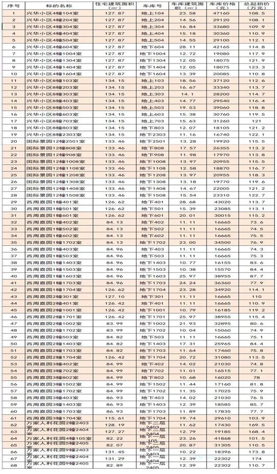 興華小區(qū)、國際景園、西周嘉園、萬家人利花園共計68套住宅,建筑面積約:82.07㎡至134.15㎡不等,起拍價73.6萬元至174萬元不等。