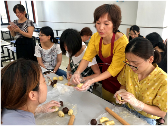 中午時分,面點老師和烘焙老師提前到場就緒,將制作包子、蛋黃酥的面粉、咸鴨蛋、餡料、手套、模具等工具和材料準備妥當?;顒诱介_始,先由兩位老師為大家科普了面點的種類和特點,隨后著重介紹今天兩款面點的制作方法和蒸烤要求。